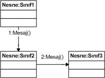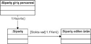 Aşağıdaki örnekte ise sipariş verme use case’i ile ilgili basit bir işbirliği diyagramını göstermektedir.. Bu sefer iki noktadan sonra sınıf isimleri yer almaktadır. Bunun nedeni ise bu sınıftan türetilen tüm nesnelerin aynı şekilde davranacağındandır.