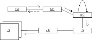 Nesne: Yukarıdaki işbirliği diyagramında bize dizge diyagramlarından da tanıdık geleceği üzere nesne aynı şekilde gösterilmektedir. Nesne kutusunun içerisinde yer alan “a” harfi nesneyi, “A” harfi ise sınıfı temsil etmektedir.
